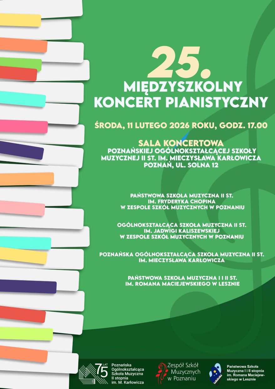 Zapraszamy serdecznie na jubileuszowy 25. Międzyszkolny Koncert Pianistyczny, który odbędzie się w środę 11 lutego o godzinie 17.00, w Sali Koncertowej naszej Szkoły.